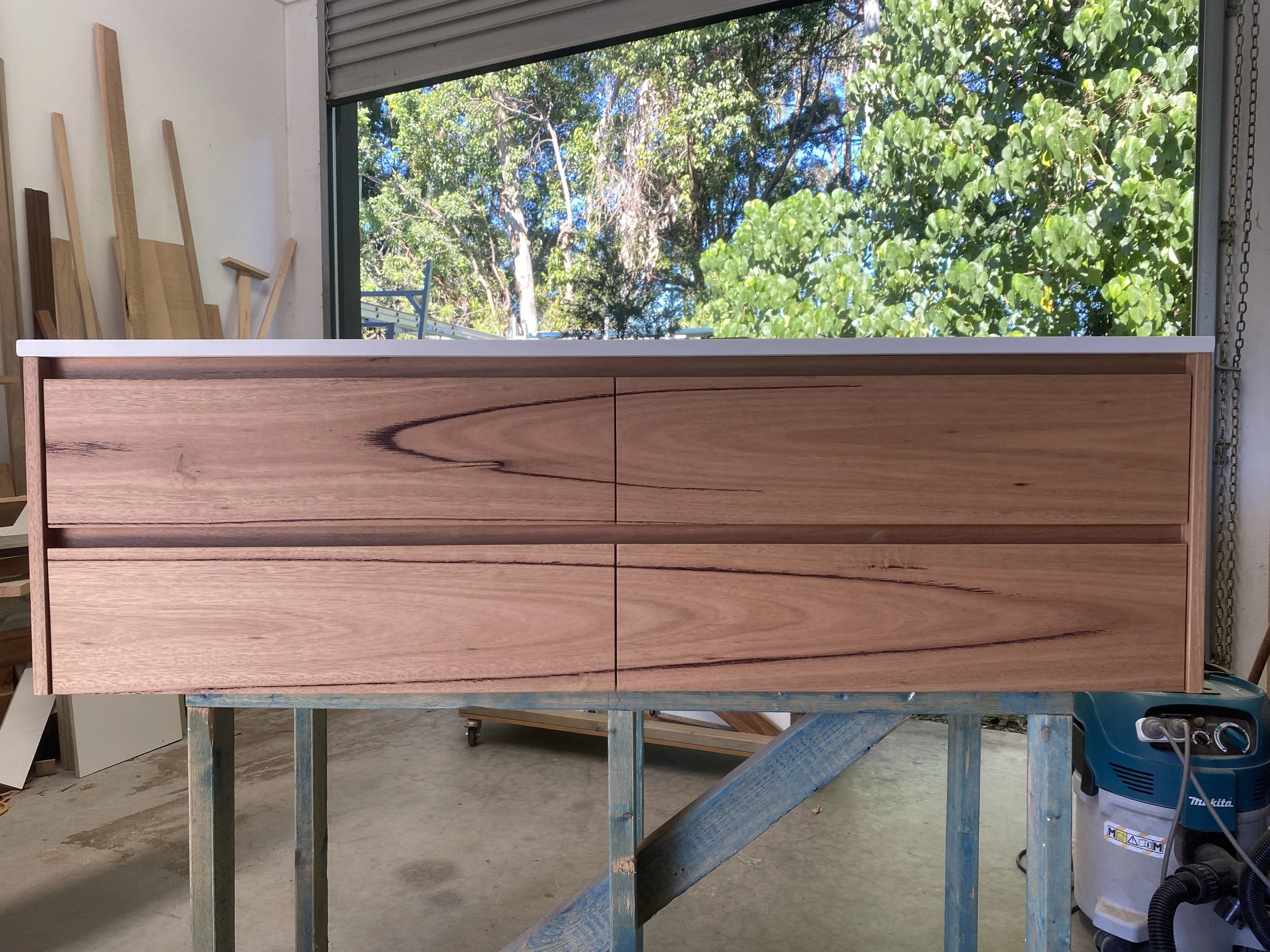Solid 20mm Spotted Gum vanity with grain-matched drawer fronts and a timber top.